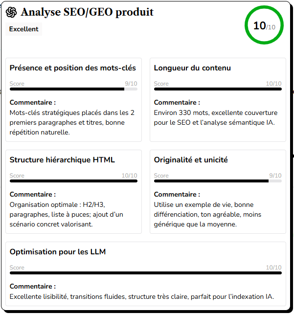 Notre système d’analyse SEO basé sur l’intelligence artificielle ne se contente pas de définir les mots-clés et les cibles de votre site e-commerce. Il est également au cœur de la création de contenu optimisé.