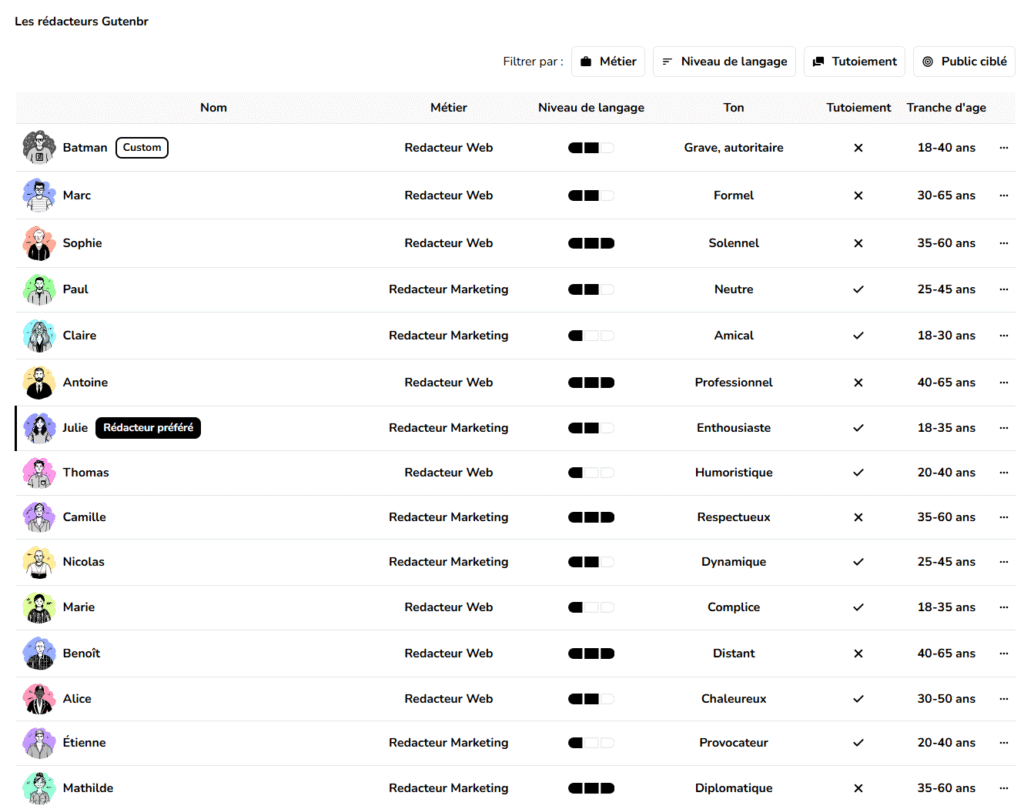 Chez Gutenbr, nos rédacteurs virtuels vous permettent de personnaliser automatiquement le ton et le niveau de langage de votre contenu.